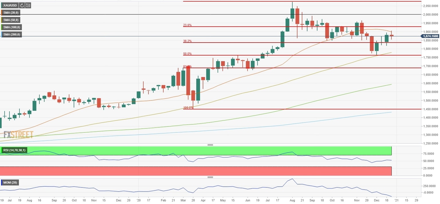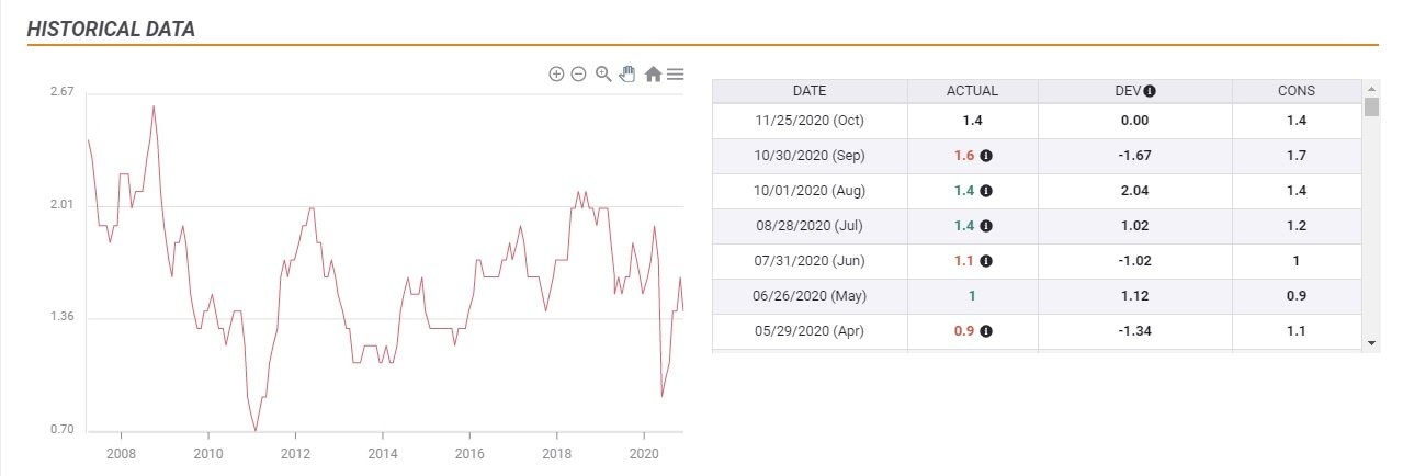En el Simposio de Política Económica de Jackson Hole en agosto, Powell anunció que la Fed apuntará a una inflación promedio como su nueva estrategia, lo que significa que no actuará incluso si la inflación supera el 2% y permanece allí por un tiempo. El índice de precios del gasto de consumo personal PCE subyacente, el indicador de inflación preferido por la Fed, cayó al 1.4% anual en octubre. La Fed podría tomar una acción pesimista, a menos que haya un salto dramático en los datos de inflación, y el XAU/USD podría cobrar un impulso alcista.
