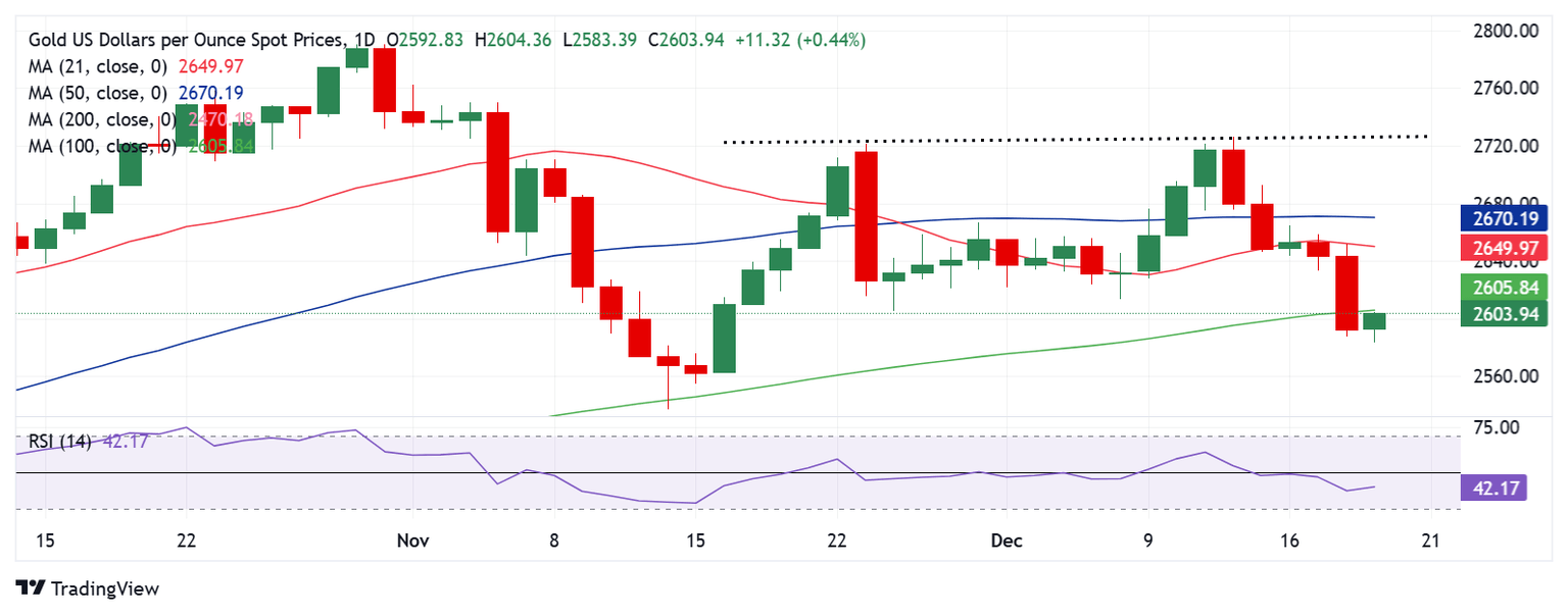 El gráfico diario muestra que el precio del Oro está probando la clave de la Media Móvil Simple (SMA) de 100 días en 2.605$ en su intento de recuperación tibia a primera hora del jueves.