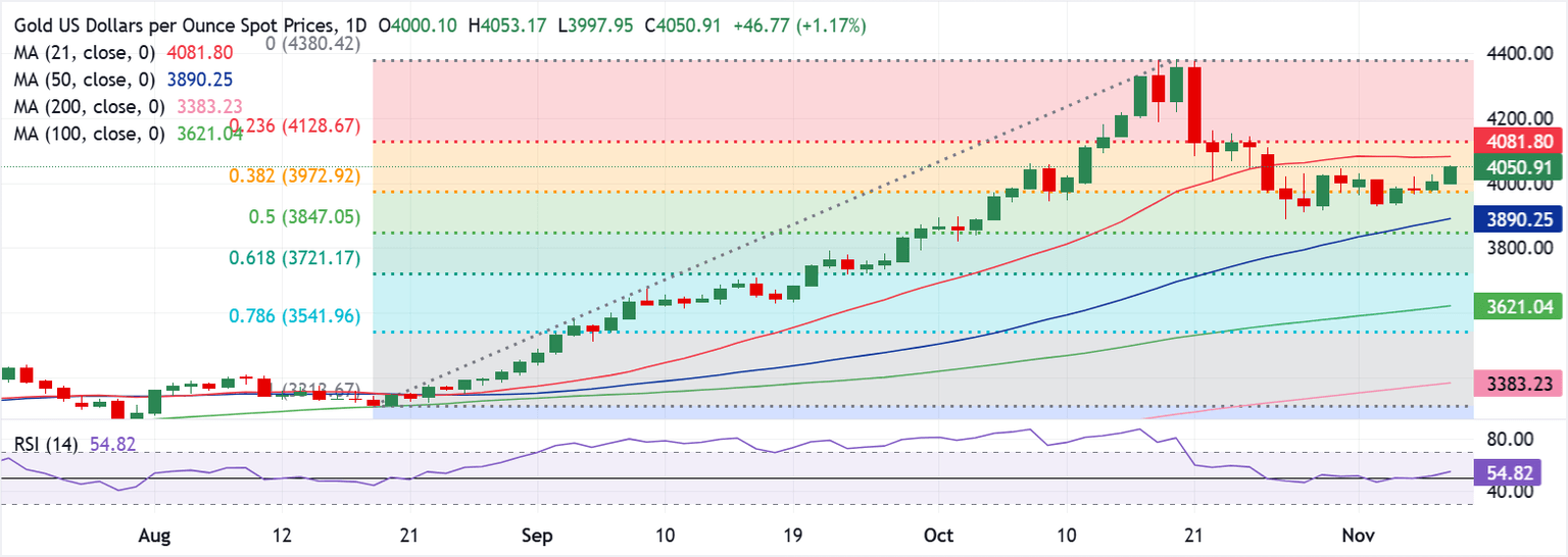 El Oro está construyendo sobre el rebote del viernes en las operaciones asiáticas del lunes, habiendo recuperado brevemente la barrera psicológica de 4.050$ para alcanzar máximos de diez días. Los operadores esperan nuevas pistas sobre el fin del cierre gubernamental récord de EE.UU. en medio de crecientes preocupaciones económicas.