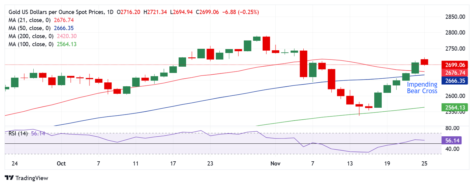 El precio del Oro recogió nuevas ofertas y saltó a casi un máximo de dos semanas de 2.721$ en las primeras operaciones. El Dólar estadounidense vio una apertura bajista en conjunto con los rendimientos de los bonos del Tesoro de EE.UU. Los operadores asiáticos llegaron a sus escritorios y reaccionaron a las noticias del fin de semana de que el presidente electo de EE.UU., Donald Trump, nombró al multimillonario Scott Bessent como su Secretario del Tesoro.