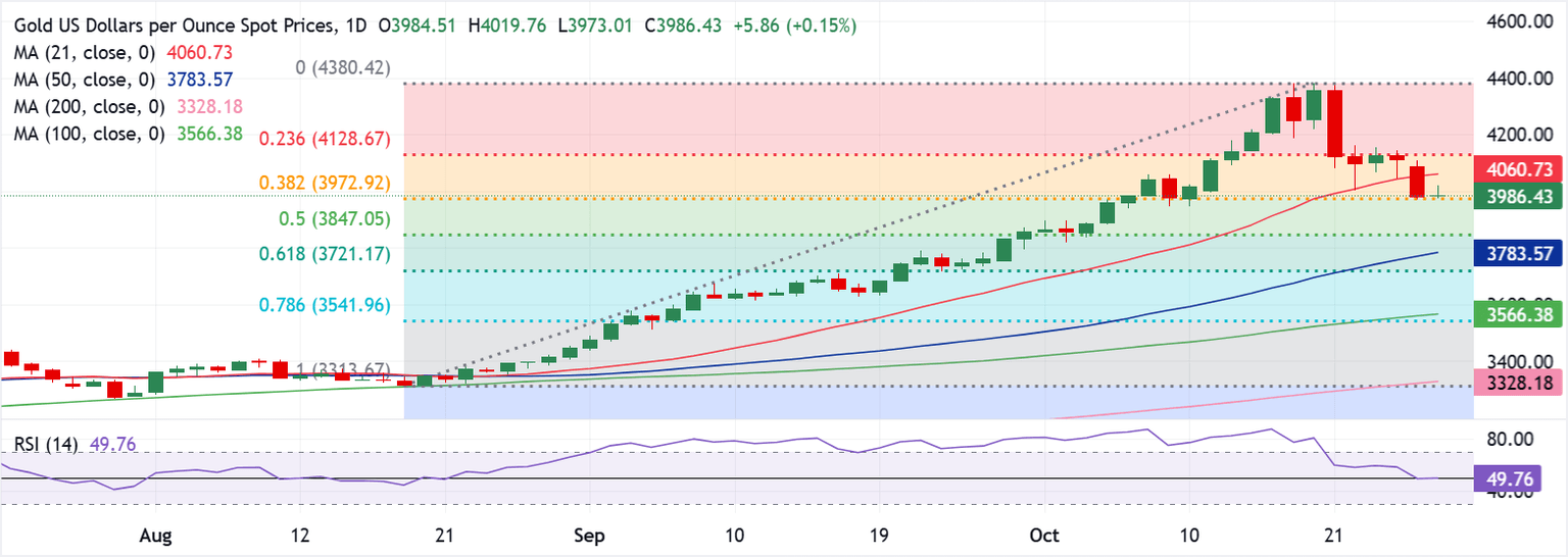 El gráfico diario muestra que el precio del Oro defiende el soporte crítico en 3.973$, que es el nivel de retroceso de Fibonacci (Fibo) del 38.2% de la subida parabólica que comenzó a mediados de agosto.