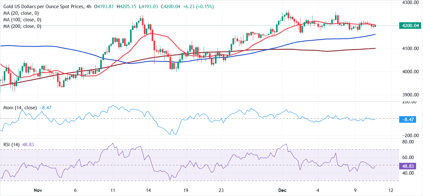 En el gráfico de 4 horas, XAU/USD cotiza en 4.201,02$, ligeramente por debajo de su apertura diaria. La media móvil simple (SMA) de 20 períodos se ha aplanado justo por encima del nivel actual y se desliza ligeramente hacia abajo. Al mismo tiempo, las SMAs de 100 y 200 períodos continúan subiendo muy por debajo del nivel actual, preservando un sesgo alcista a medio plazo. El soporte se alinea con la SMA de 100 períodos en 4.161,04$, mientras que la SMA de 200 períodos en 4.100,74$ respalda la tendencia más amplia. Mientras tanto, el indicador Momentum se mantiene por debajo de 0 y avanza, mientras que el Índice de Fuerza Relativa (RSI) se sitúa en 49 (neutral) y gira hacia arriba, indicando que los vendedores están perdiendo fuerza.