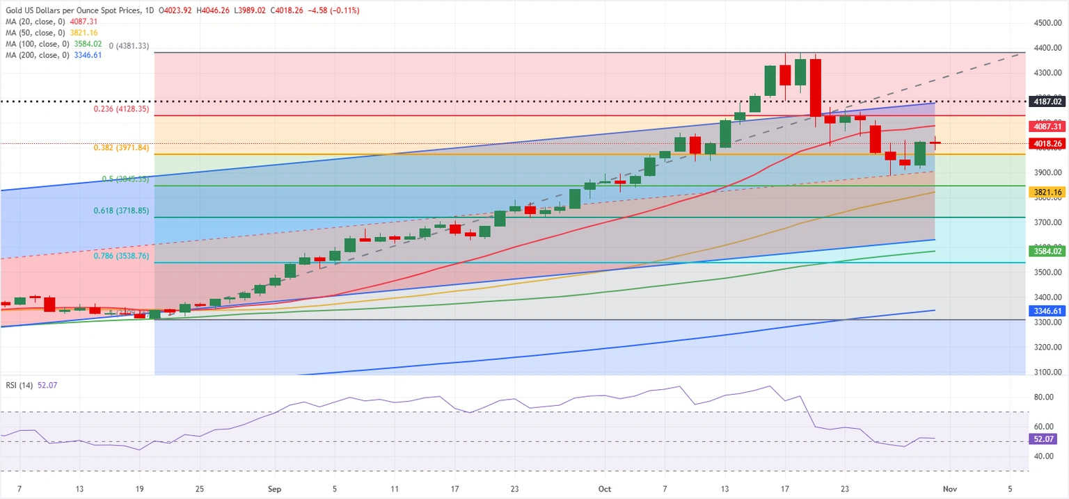 El Oro (XAU/USD) permaneció bajo presión bajista y tocó su nivel más débil desde principios de octubre, por debajo de los 4.000$, presionado por los comentarios cautelosos del presidente de la Reserva Federal (Fed), Jerome Powell, sobre el alivio de la política y una desescalada en el conflicto comercial entre Estados Unidos (EE.UU.) y China. Las próximas publicaciones de datos macroeconómicos de EE.UU. y los comentarios de los funcionarios de la Fed podrían influir en la valoración del Oro a corto plazo.
