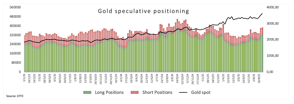 Según los datos de la CFTC para la semana que finalizó el 9 de septiembre, las posiciones largas netas especulativas en Oro aumentaron a niveles no vistos desde febrero, cerca de 261.800 contratos, mientras que el interés abierto subió por tercera semana consecutiva, acercándose a 510.000 contratos, el nivel más alto desde marzo.