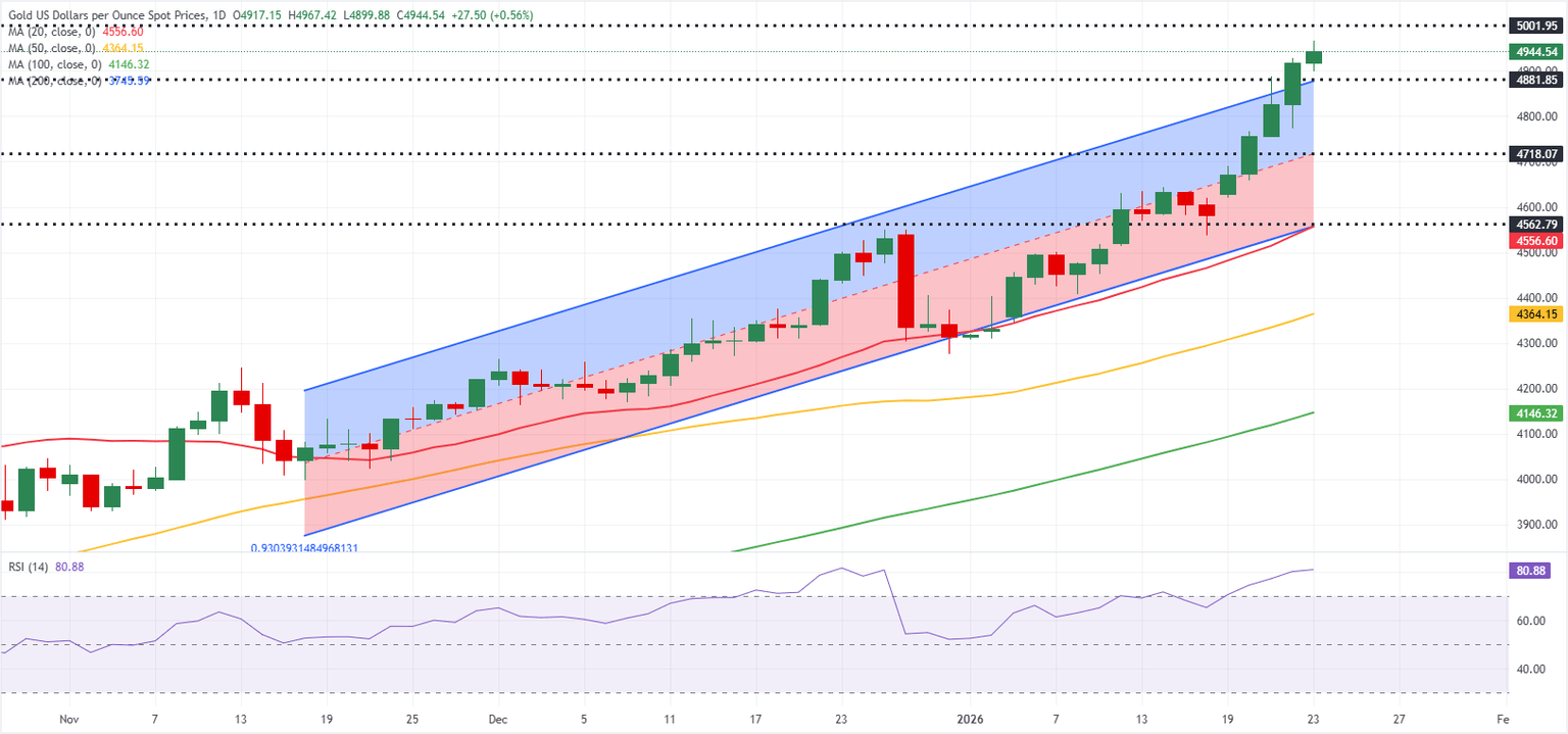 El Oro (XAU/USD) comenzó la semana con un fuerte impulso y adquirió un impulso alcista, alcanzando un nuevo récord histórico de 4.967$ en la sesión asiática del viernes. La volatilidad de XAU/USD probablemente se mantendrá alta a corto plazo, con los inversores manteniendo un estrecho seguimiento de la geopolítica y las decisiones de política monetaria de la Reserva Federal (Fed).