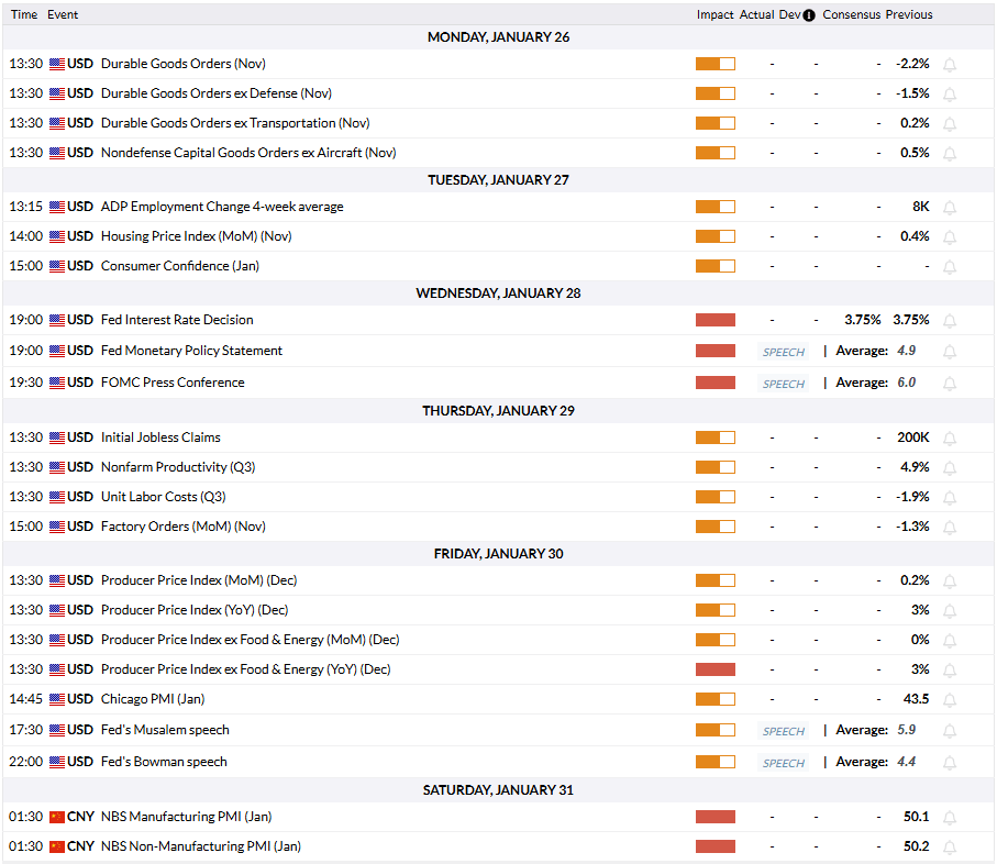 El calendario económico ofrecerá algunos datos de nivel medio en la primera mitad de la semana, incluidos los pedidos de bienes duraderos de EE.UU. de noviembre y el índice de confianza del consumidor de enero. Sin embargo, es probable que los inversores ignoren estas cifras y se mantengan al margen hasta que la Fed anuncie su decisión de política monetaria en la sesión americana del miércoles.