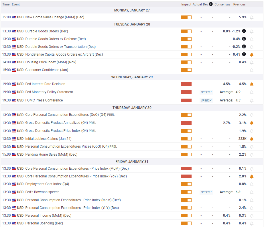 La Reserva Federal (Fed) llevará a cabo su primera reunión de política monetaria de 2025 la próxima semana. Según la herramienta FedWatch del CME Group, los mercados ven prácticamente nulas las posibilidades de que la Fed opte por un recorte de tasas de 25 puntos básicos (pb). Por lo tanto, los inversores escrutarán la declaración de política y los comentarios del presidente de la Fed, Jerome Powell, en la conferencia de prensa.