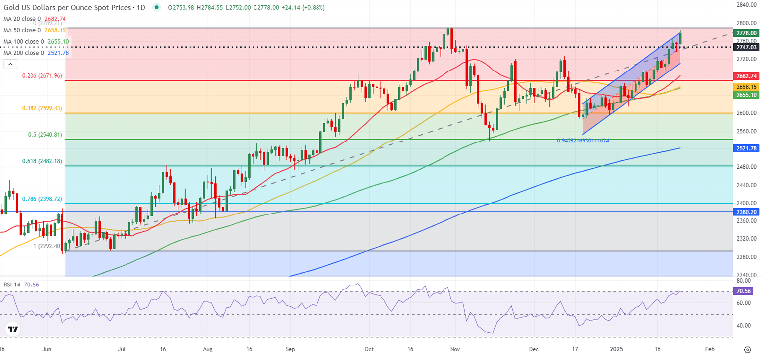 Tras un inicio de semana cauteloso, el Oro (XAU/USD) revirtió su dirección y registró ganancias semanales cercanas al 3%, alcanzando su nivel más alto desde el 31 de octubre en la región de 2.780$ el viernes. A medida que la atención del mercado se centra en los eventos clave de los bancos centrales de la próxima semana, las perspectivas técnicas del Oro siguen siendo alcistas, aunque muestran signos de condiciones de sobrecompra.