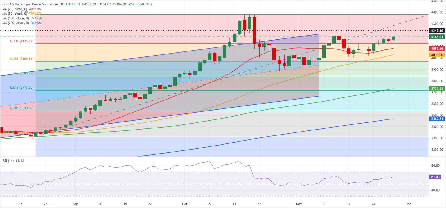El miércoles, los datos de EE.UU. mostraron que hubo 216,000 solicitudes iniciales de subsidio de desempleo en la semana que terminó el 22 de noviembre, una disminución de 6,000 respecto al nivel revisado de la semana anterior. Además, la Oficina del Censo de EE.UU. anunció que los pedidos de bienes duraderos aumentaron un 0.5% en septiembre, superando la expectativa del mercado de un aumento del 0.3%. Como estas cifras no lograron influir en la valoración del mercado sobre la perspectiva de política de la Fed, el Oro mantuvo su posición y cerró bien por encima de 4,100$ antes del festivo de Acción de Gracias en EE.UU.