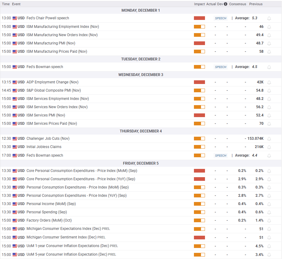 Los funcionarios de la Fed no podrán comentar sobre la perspectiva de política hasta la reunión del 9-10 de diciembre. Por lo tanto, los inversores examinarán de cerca las publicaciones de datos de EE.UU. para confirmar o reevaluar la probabilidad de un recorte de tasas.