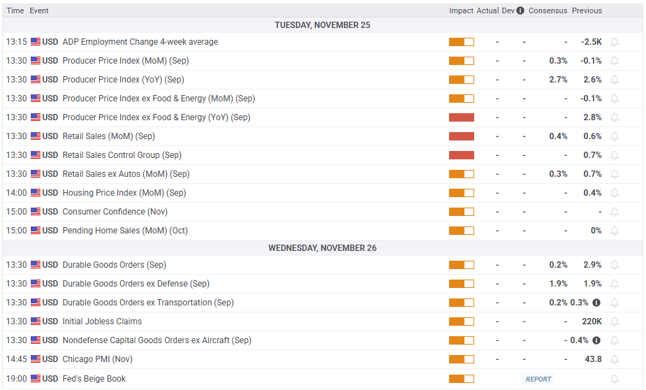 Los inversores prestarán especial atención a los comentarios de los responsables de políticas de la Fed antes de que comience el período de silencio el 29 de noviembre. El posicionamiento del mercado sugiere que hay espacio para una mayor fortaleza del USD en caso de que los funcionarios de la Fed continúen expresando su oposición a un recorte de tasas en diciembre. Por el contrario, el Oro podría ganar tracción si los responsables de políticas enfatizan el empeoramiento de las condiciones del mercado laboral y argumentan a favor de otro recorte de tasas en la última reunión de política del año.