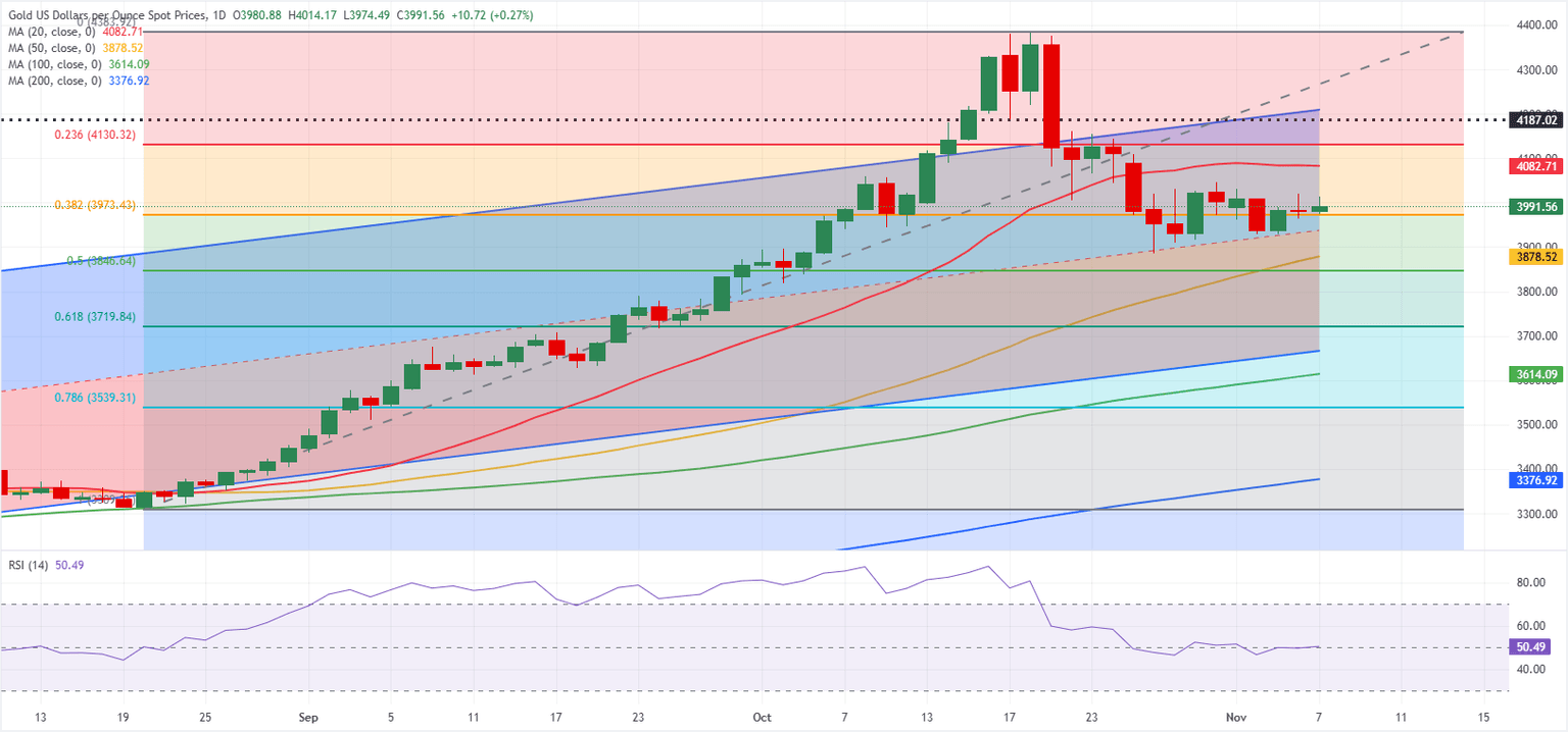 El Oro (XAU/USD) luchó por hacer un movimiento decisivo en ninguna dirección y pasó la semana fluctuando dentro de un canal relativamente estrecho en torno a 4.000$. Con la geopolítica pasando a un segundo plano y el cierre del gobierno en curso causando el aplazamiento de la publicación de datos económicos en Estados Unidos (EE.UU.), los inversores examinarán los comentarios de los responsables de la política monetaria de la Reserva Federal (Fed) para evaluar las probabilidades de otro recorte de tasas de interés en diciembre.