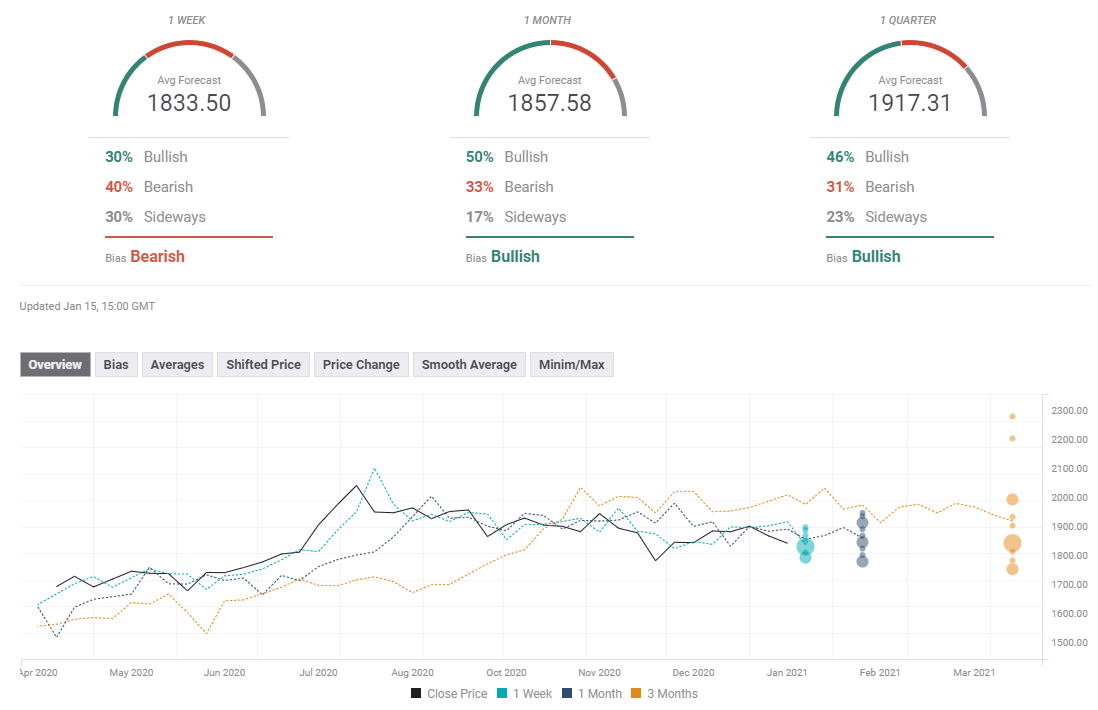 Según la Encuesta de Previsión de Divisas, el 40% de los expertos ve el XAU/USD bajo presión en el corto plazo. Siguiendo la acción del precio semanal, un giro bajista podría también estar en la perspectiva de un mes, cuyo promedio ahora apunta al objetivo de 1857$, comparado con los 1893$ de la pasada semana.