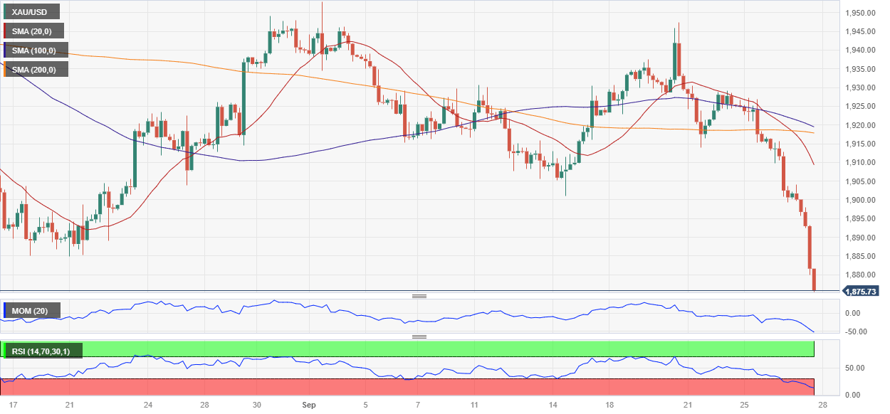 El XAU/USD cotiza en nuevos mínimos intradía a mediados de la sesión estadounidense, y las lecturas técnicas en el gráfico diario sugieren que los vendedores están lejos de terminar. El metal brillante se desplomó por debajo de todas sus medias móviles, con la SMA de 20 finalmente acelerando hacia el sur por debajo de las más largas. Al mismo tiempo, los indicadores técnicos se dirigen firmemente hacia el sur, muy por debajo de sus líneas medias, en línea con una caída continuada. El mínimo mensual de agosto en 1.884,70$ es ahora el nivel de soporte inmediato.