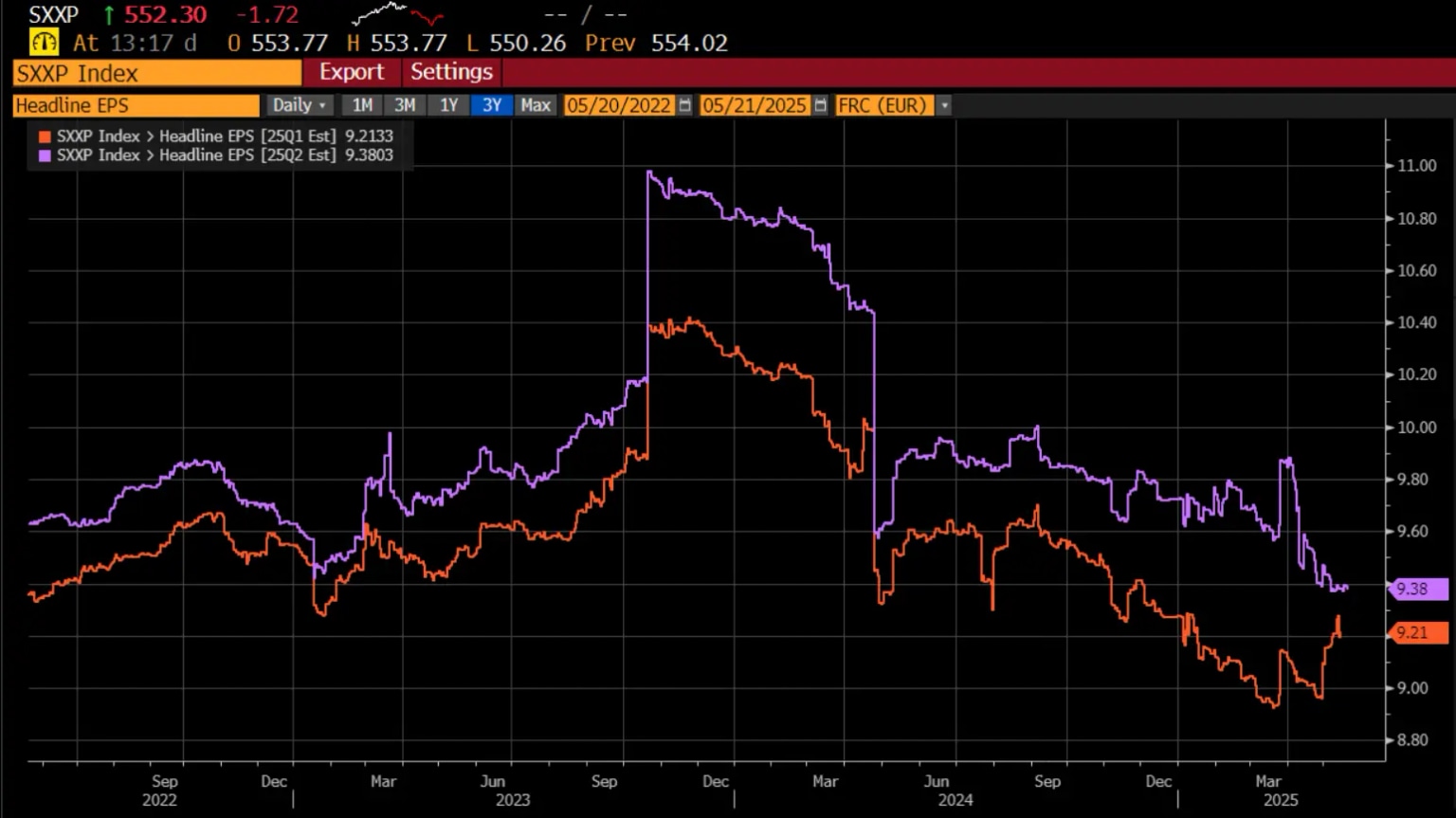 Las estimaciones de ganancias para el Eurostoxx 600 también se han revisado a la baja, pero no en la misma medida que las acciones estadounidenses.