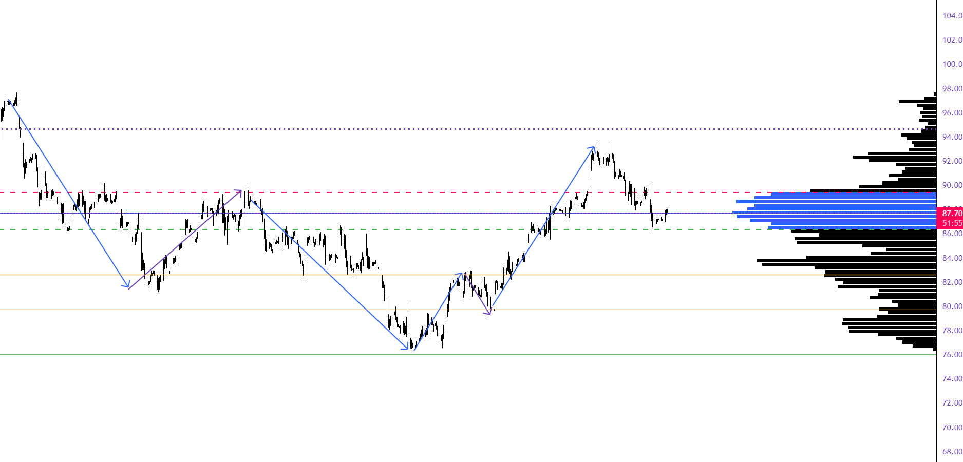 El gráfico de 4 h del precio WTI sugiere una estructura alcista impecable después del impulso alcista de la semana pasada que llevó el precio hasta los 93.63 el precio ha corregido a la zona de volumen entre los 86-89, la corrección está rompiendo la lógica tendencial alcista que lleva el precio, por lo tanto, los escenarios podrían ser: