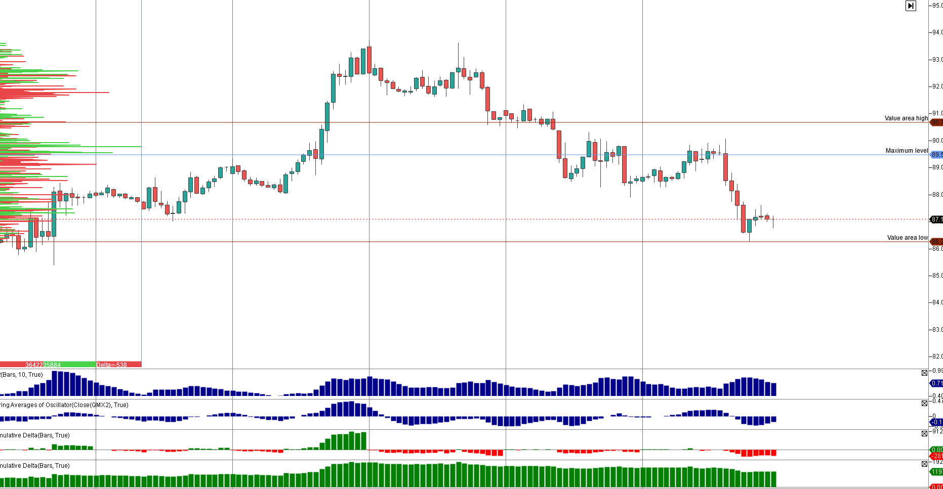 La disminución de la demanda en el futuro de noviembre se ha mantenido ligeramente estable, disminuyendo desde los máximos muy poco, al igual que la volatilidad, en el gráfico se puede notar en valle verde en la parte inferior que representa el delta acumulado en gráfico de h1, donde la fuerza de la demanda aún se mantiene.