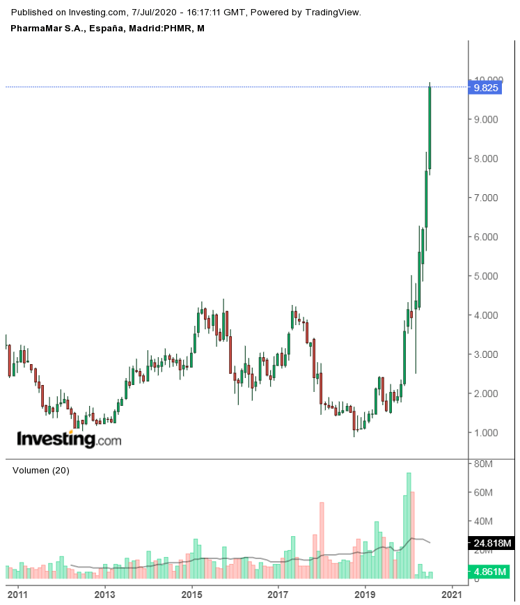 Durante los últimos días podíamos leer en Expansión.com diversas noticias que apoyan a seguir con su impulso alcista actual como las siguientes: el ingreso de 89 millones de € por parte de su socio americano Jazz Pharmaceuticals, el pago en efectivo del primer dividendo de su historia por importe de 0,04 € brutos acción, los resultados de los estudios realizados por la farmacéutica surcoreana Boryung Pharmaceutical con el antitumoral Aplidin, desarrollado por PharmaMar, en el tratamiento del coronavirus Covid-19, y el contrasplit que va a realizar a mediados de julio.