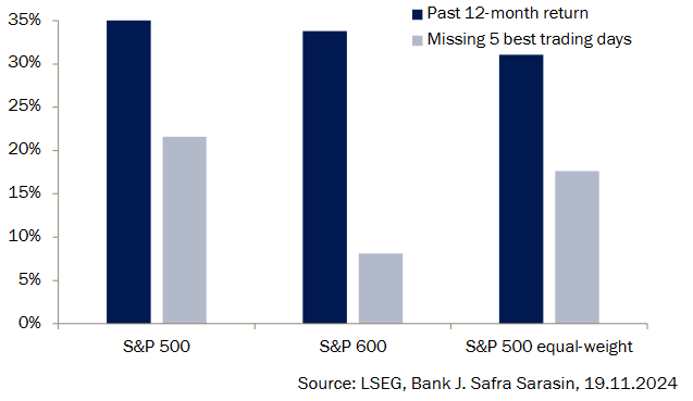 Sin embargo, lo que ha estropeado la experiencia de mantener pequeñas capitalizaciones ha sido el elevado nivel de volatilidad. Mientras que el S&P 500 experimentó una subida bastante estable, las small caps registraron movimientos diarios significativamente mayores, lo que ha generado que el que el market timing y la firmeza en el mantenimiento de la posición ganaran relevancia a la hora de generar retornos positivos. Si se hubieran perdido los cinco mejores días de los últimos 12 meses, la rentabilidad de las pequeñas capitalizaciones habría sido un 17% inferior a la de las grandes capitalizaciones, mientras que, si no se hubiera perdido ningún día, sólo habría sido un 1% inferior (Gráfico 2).
