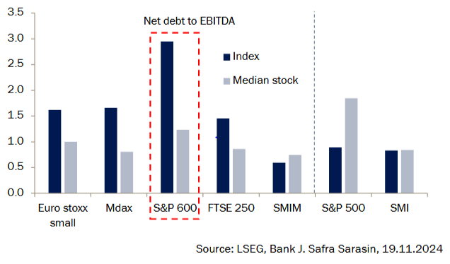 Aunque la subida de tipos ha perjudicado a las small caps en los últimos años, creemos que este periodo debe considerarse atípico (Gráfico 3). El fuerte aumento anticíclico de los tipos en 2022 y 2023 se produjo de forma inesperada y provocó efectos secundarios como la quiebra del Silicon Valley Bank. A esto siguió un deterioro de las condiciones de préstamo para las small caps, que tienden a depender mucho más de la financiación bancaria que sus homólogas de gran capitalización. En nuestra opinión, el apalancamiento en las pequeñas capitalizaciones es menos problemático, ya que está bastante concentrado en unas pocas compañías. Un examen de la acción mediana del S&P 600 muestra que no está más apalancada que la acción mediana del S&P 500. En todo caso, las ratios de apalancamiento agregados son mucho más elevados que los de las compañías de gran capitalización. En todo caso, las ratios de apalancamiento agregados del S&P 500 pueden subestimar la exposición real del índice, ya que algunos de sus principales componentes son acreedores netos (Gráfico 4).