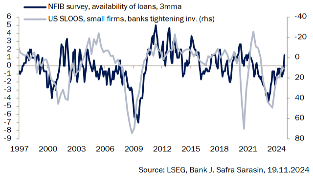 Mientras tanto, las condiciones de financiación para las pequeñas y medianas compañías han empezado a mejorar, como indica la encuesta NFIB de pequeñas compañías. Por primera vez desde mediados de 2021, el componente de la NFIB «disponibilidad de préstamos» ha pasado a ser positivo en 12 meses, una medida que se correlaciona bien con las condiciones de préstamo bancario para las pequeñas compañías de la encuesta de altos funcionarios de préstamos (Gráfico 5). Las condiciones de préstamo también han mejorado en octubre, hasta el nivel más favorable desde junio de 2022 y en línea con una aceleración más amplia del ciclo estadounidense. Las small caps deberían seguir beneficiándose de este contexto macroeconómico. El impulso del NFIB ha alcanzado su nivel más alto desde finales de 2022, lo que sugiere que las small caps tienen margen para obtener mejores resultados.