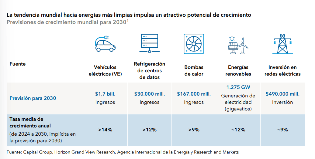 - En Capital Group se han identificado oportunidades atractivas a largo plazo en el sector automovilístico, la refrigeración de los centros de datos, las bombas de calor, las energías renovables y las redes eléctricas.