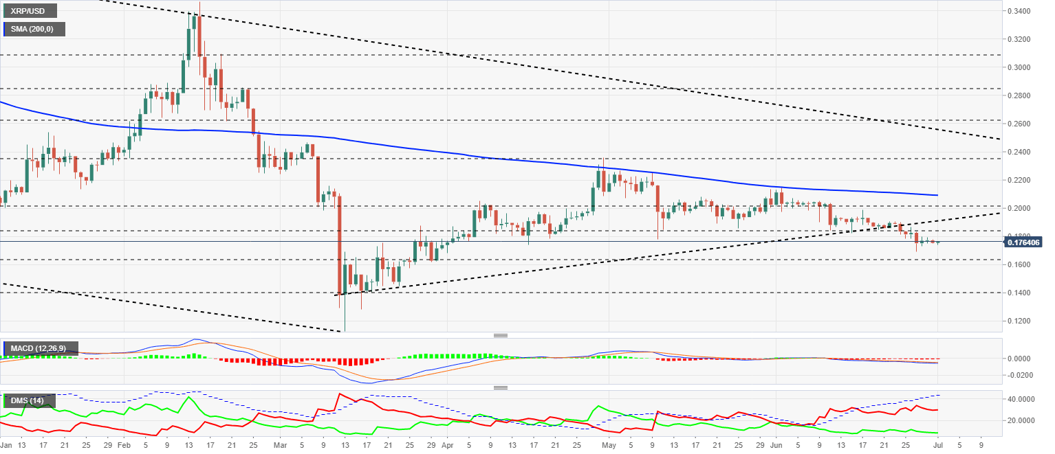 El par XRP/USD cotiza en estos momentos en el nivel de precio de $0.175 y mantiene la agonía del condenado tras perder el soporte de la linea alcista que soportaba el precio desde el mes de Marzo.