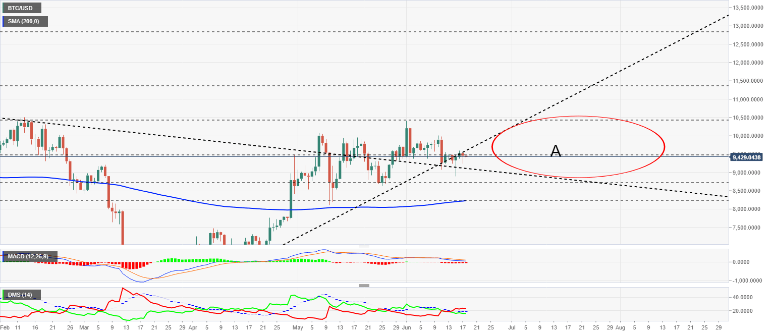 El par BTC/USD cotiza en estos momentos en el nivel de precio de $9430 mientras se adentra un poco más en el escenario triangular expansivo (A).
