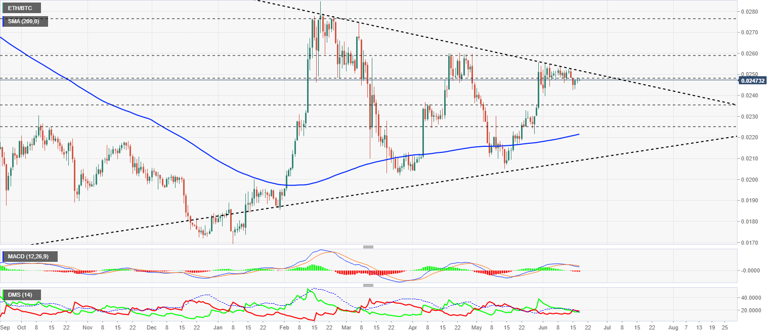 El par ETH/BTC cotiza en estos momentos en el nivel de precio de 0.0247 y como en el caso del chart de dominancia, se mueve muy cerca de la resistencia mayor del escenario actual en 0.0252.