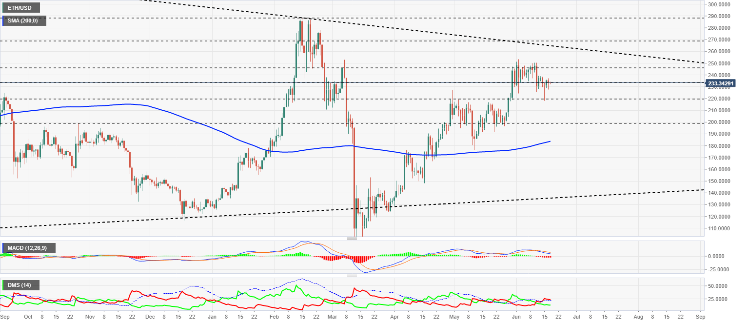 El par ETH/USD cotiza en estos momentos en el nivel de precio de $233.4 y se mantiene a distancia de ataque del nivel de resistencia mayor del escenario actual.