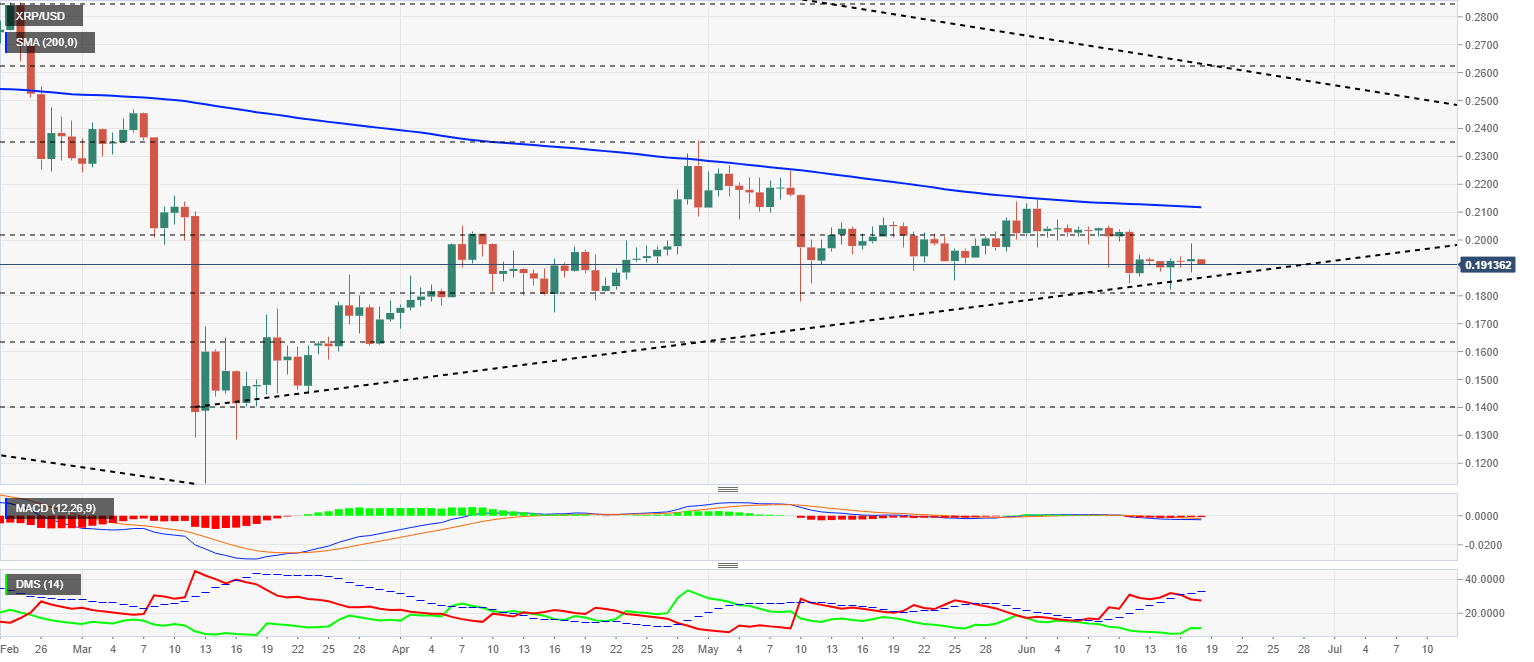 El par XRP/USD cotiza en estos momentos en el nivel de precio de $0.1919 y no reacciona positivamente a las mejores perspectivas para los toros que insinúan los indicadores. El soporte clave del escenario actual se encuentra en $0.187, y si el Ripple lo perforase a la baja podríamos ver un sell-off de proporciones épicas.