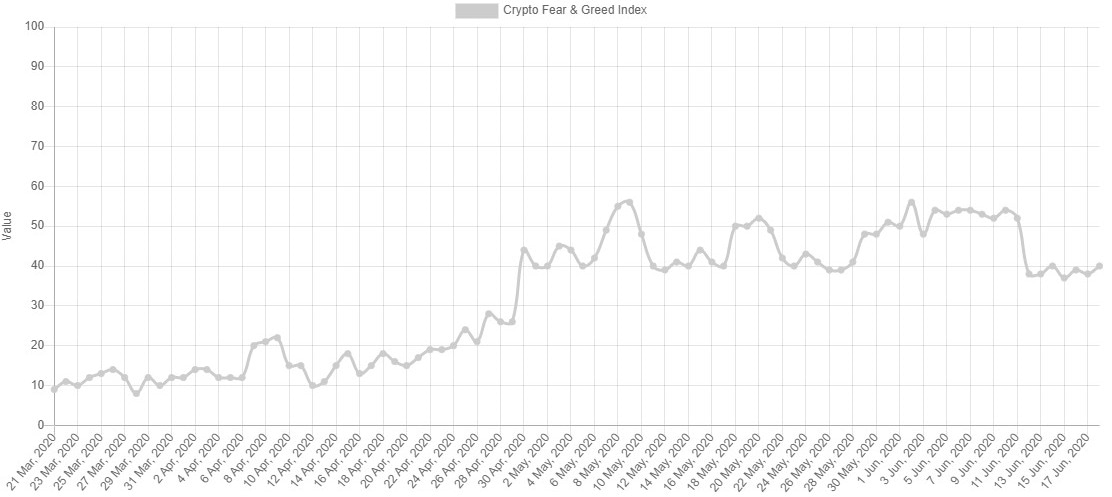 El nivel de sentimiento del mercado continúa en indicando que hay poca confianza entre los partícipes del mercado. El indicador creado por el site alternative.me alcanza hoy el nivel 40.