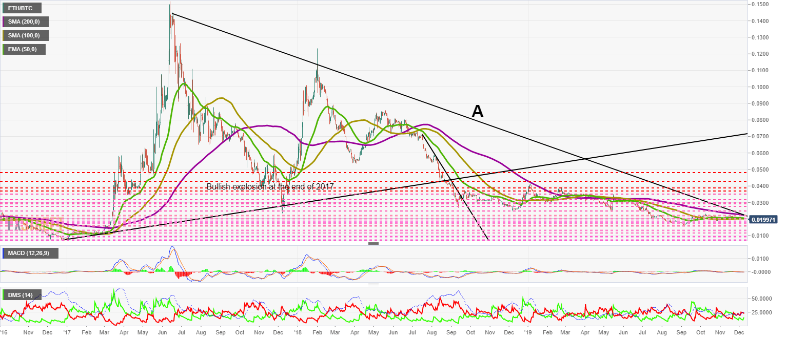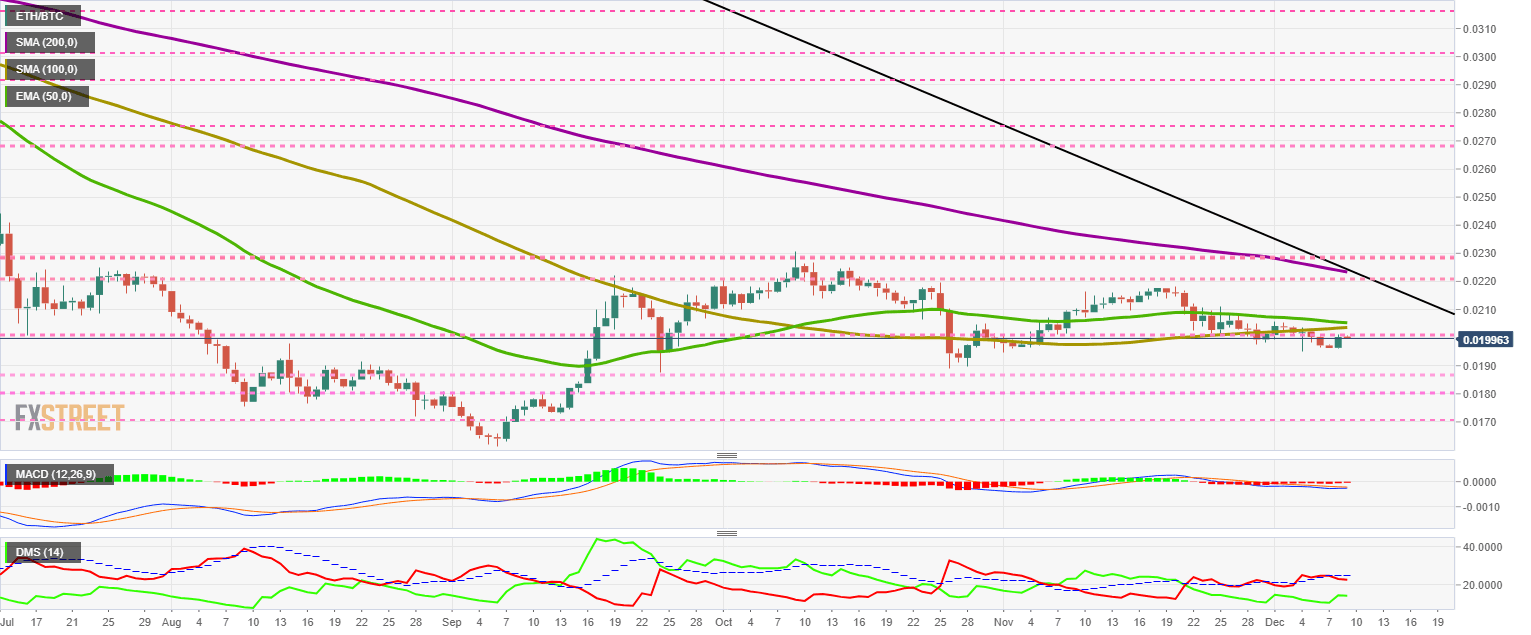 El par ETH/BTC cotiza en estos momentos en el nivel de precio de 0.0199 y se mantiene por debajo del nivel de soporte clave, machacando la paciencia de los traders que conocen la importancia del nivel 0.020.