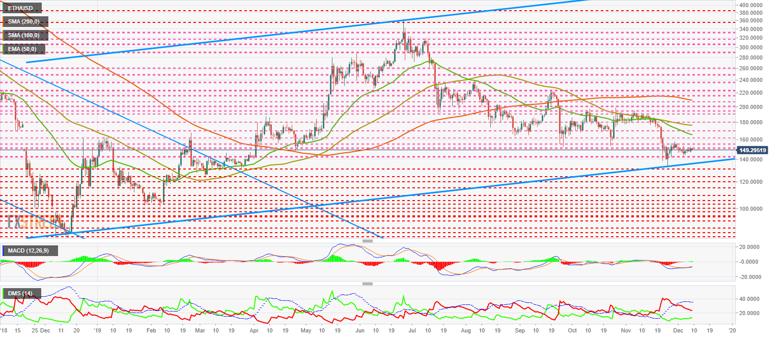 El par ETH/USD cotiza en estos momentos en el nivel de precio de $149.4 y mantiene la tensión entre los que necesitan ver el precio por encima del nivel $150. La base del actual canal alcista se encuentra muy cerca, y no se debe descartar una nueva visita hacia la zona de los $135.