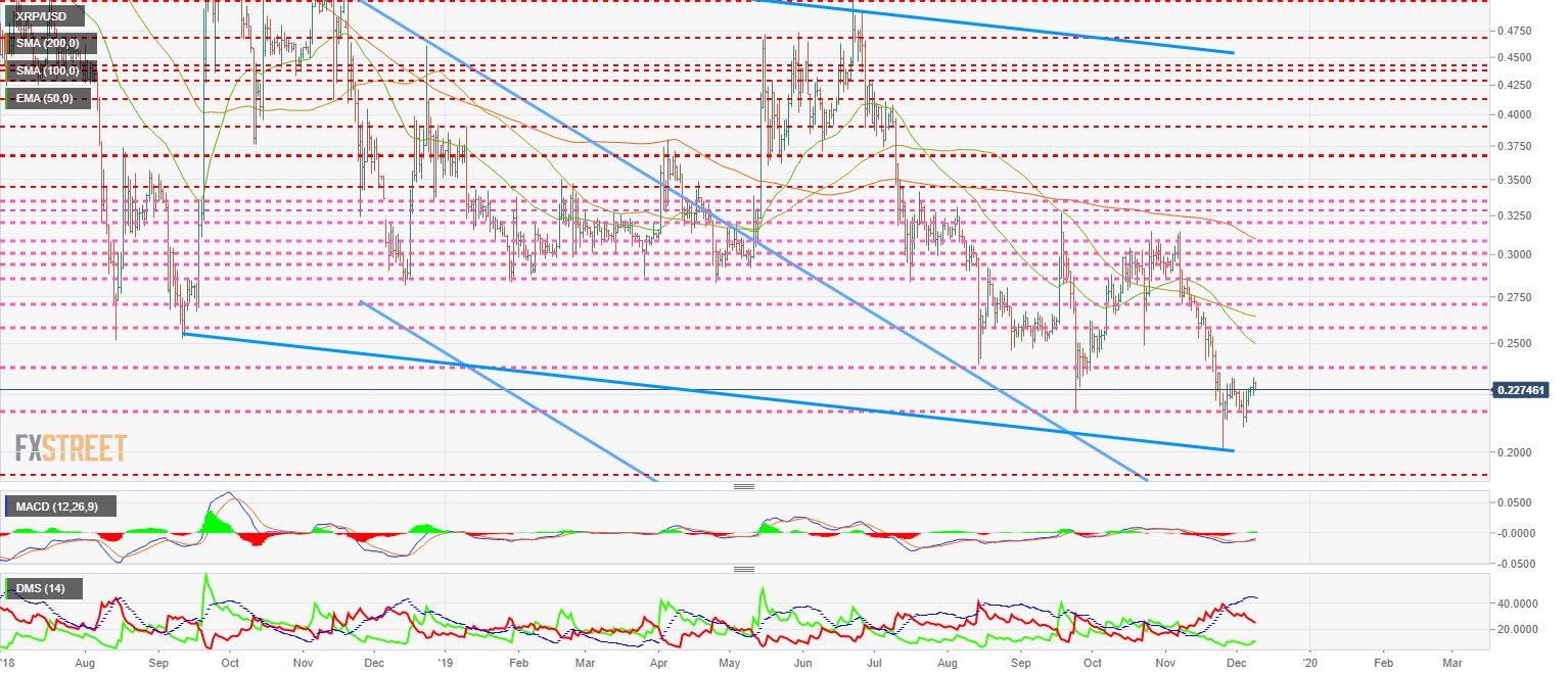 El par XRP/USD cotiza en estos momentos el nivel de precio de $0.227 y se mantiene pegado encima de la base del canal bajista de largo plazo. La linea base pasa en estos momentos por el nivel de precio de $0.20 y una perforación de este nivel podría activar ventas masivas en la cryptocurrencie de Ripple Ltd.