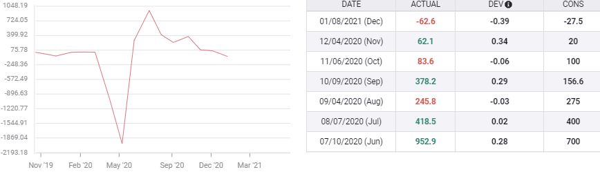El cambio neto en el empleo en diciembre fue negativo por primera vez desde abril, eliminando 62.600 puestos de trabajo, más del doble de la estimación de -27.500. Las ventas manufactureras en noviembre fueron débiles, cayendo un 0.6% en un pronóstico de -0.1% después de un aumento del 0.2% en octubre.