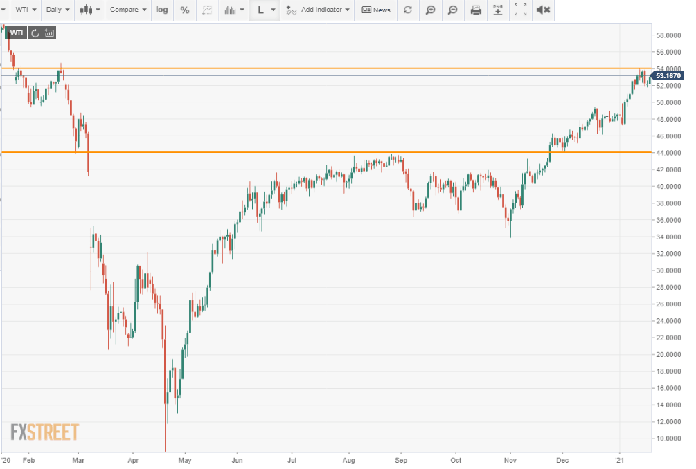 Aunque la materia prima fue rechazada en la zona de 54$ la semana pasada después de tres intentos, eso ha hecho poco por alterar la flotabilidad del WTI a la luz del repunte global esperado el próximo año mientras la distribución de vacunas reduce gradualmente la pandemia.