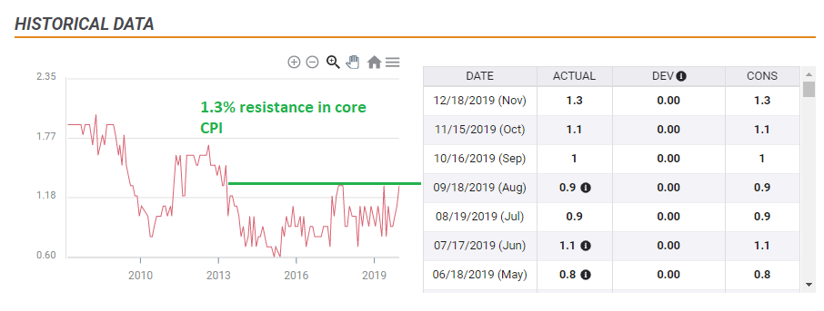 El aumento anual del 1.3% de noviembre de 2019 en el IPC básico coincidió con el observado en mayo del año pasado. Sin embargo, una aceleración al 1.4% ya enviaría la acción del precio al nivel más alto desde marzo de 2013, hace más de seis años. Y eso ya podría impulsar el euro.