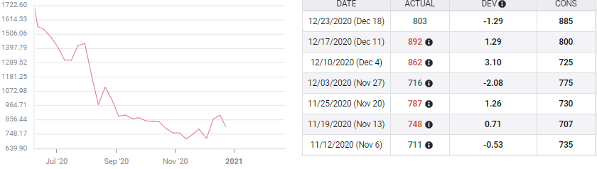 Se pronosticó que la mejora continuaría en la semana del 13 de noviembre con un pronóstico de 707.000, en cambio, las reclamaciones aumentaron a 748.000. La semana siguiente, el 20 de noviembre, la predicción fue de 730.000, y el resultado se situó en 787.000. En la última semana del mes, el 27 de noviembre, el proceso se revirtió, con un pronóstico de 775.000, y una realidad de 716.000.
