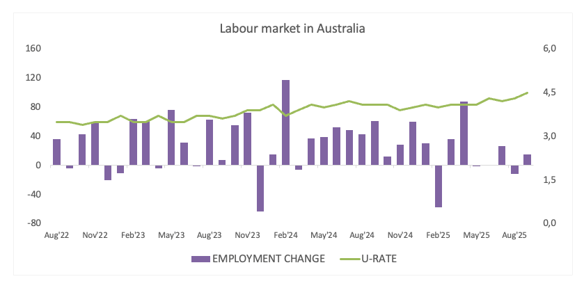 El mercado laboral, sin embargo, muestra signos de fatiga. La tasa de desempleo subió al 4.5% en septiembre desde el 4.3%, mientras que el cambio en el empleo aumentó en solo 14.9K individuos, por debajo de las previsiones. No es una señal de alerta aún, pero sugiere que el impulso en la contratación está disminuyendo.