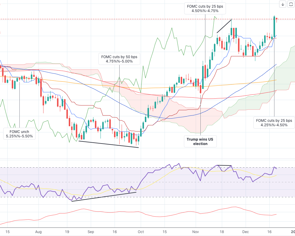 En octubre, el Dólar estadounidense inició un rally significativo, que se detuvo brevemente alrededor de las elecciones estadounidenses a principios de noviembre. Tras los resultados electorales y la creciente probabilidad de un dominio total de los republicanos, el Índice del Dólar DXY reanudó su tendencia alcista, superando la barrera de 108.00 por primera vez desde noviembre de 2022.