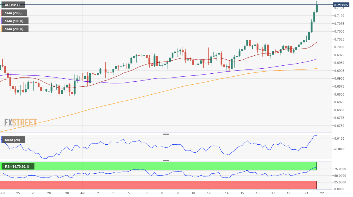 El par AUD/USD cotiza cerca del máximo mencionado, listo para extender su avance a pesar de estar sobrecomprado en el corto plazo. El gráfico de 4 horas muestra que los indicadores técnicos se dirigen firmemente hacia el norte en niveles extremos, ya que el par se desarrolla muy por encima de todos sus promedios móviles. El par ahora podría extender su recuperación hacia 0.7200 antes de alcanzar el interés de venta.