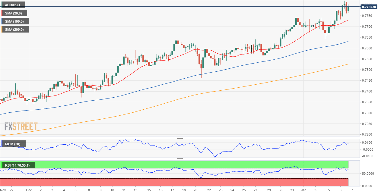 El par AUD/USD se mantiene cerca del máximo diario mencionado, alcista en el corto plazo. El gráfico de 4 horas muestra que el par se está desarrollando firmemente por encima de una media simple alcista de 20, que sigue avanzando más allá de las más largas. El indicador Momentum reanudó su avance dentro de nivel positivo mientras que el indicador RSI se consolida cerca de lecturas de sobrecompra, favoreciendo otro tramo hacia el norte hacia la zona de precios de 0.7900.
