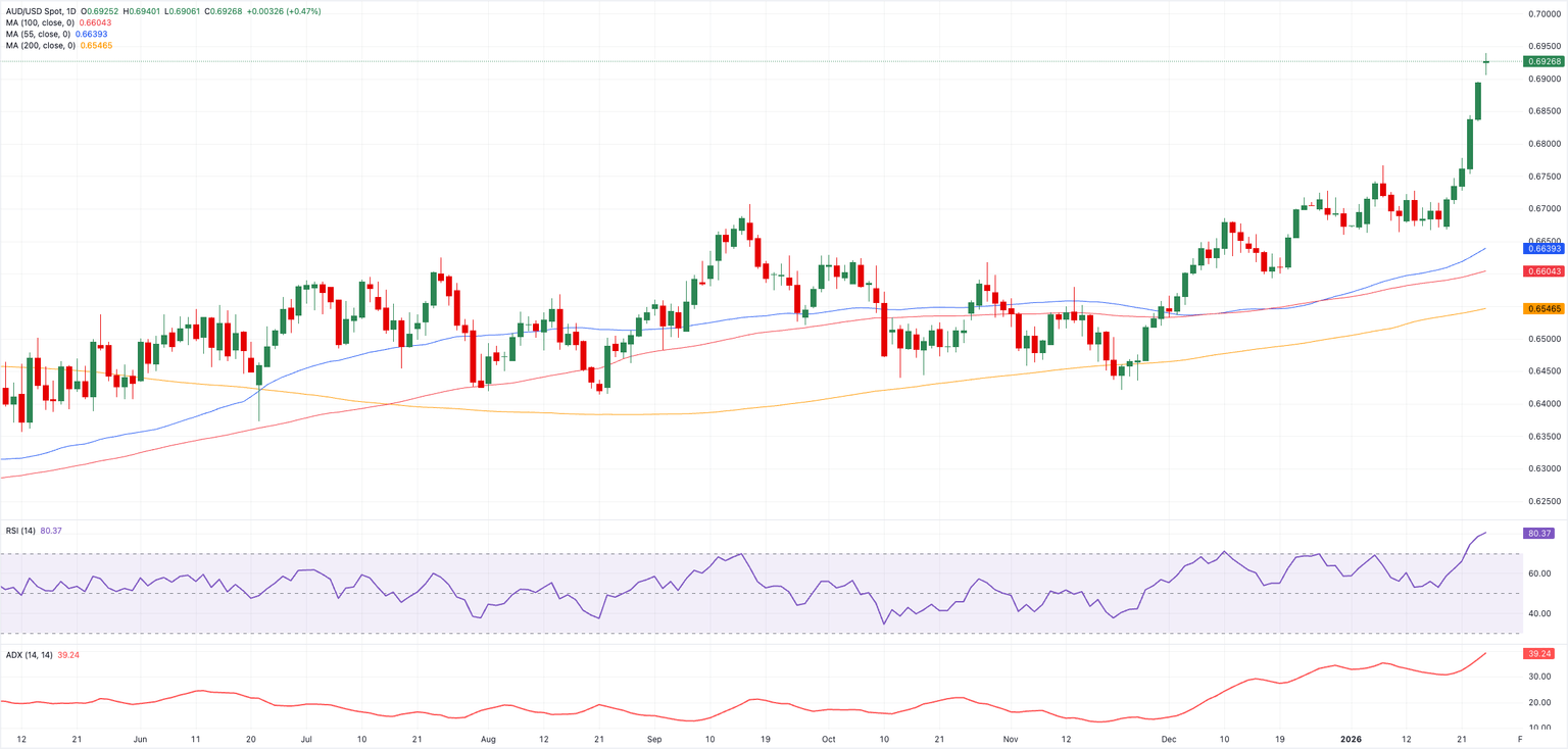 El Dólar australiano (AUD) comienza la semana con buen pie, con su tendencia alcista en curso mostrando pocas señales de perder impulso. Esto está empujando al AUD/USD a una sexta ganancia diaria consecutiva y, notablemente, de vuelta por encima de la marca de 0.6900 por primera vez desde octubre de 2024.