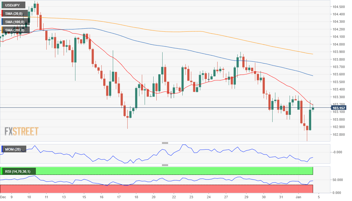 El par USD/JPY todavía corre el riesgo de caer aún más, con el próximo objetivo bajista de 101.17, el mínimo mensual de marzo de 2020. El gráfico de 4 horas muestra que una SMA de 20 firmemente bajista limita los avances mientras acelera hacia el sur por debajo de las más largas. El indicador Momentum se dirige hacia el norte justo por encima de su línea media, pero el RSI giró hacia el sur por debajo de su nivel 50 después de corregir las lecturas de sobreventa.