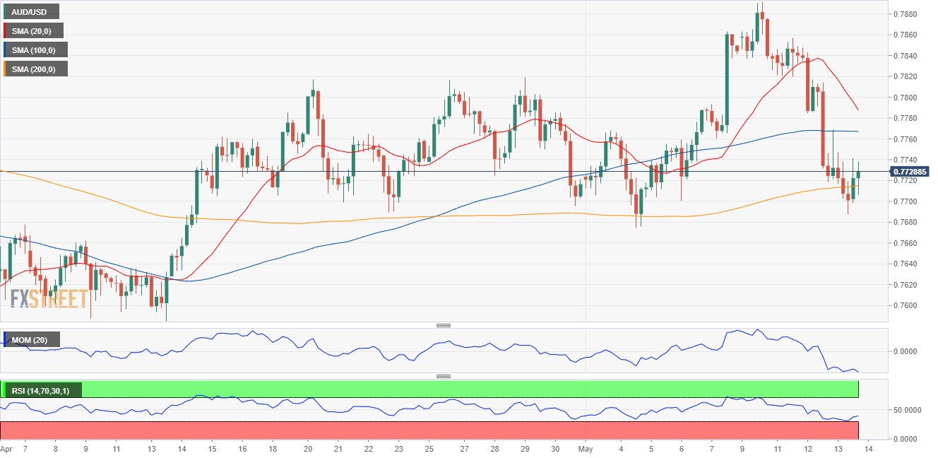 El par AUD/USD mantiene el tono amargo y aún podría caer a mínimos más frescos por debajo del nivel de 0.7700. El gráfico de 4 horas muestra que el par está luchando por mantenerse por encima de una media simple de 200, pero también que la media móvil de 20 ha acelerado su declive por encima del nivel actual. Los indicadores técnicos carecen de fuerza direccional y se mantienen en niveles negativos. El par se ha encontrado con compradores en la parte inferior de su último rango, pero el riesgo de un nuevo tramo hacia el sur ha aumentado.