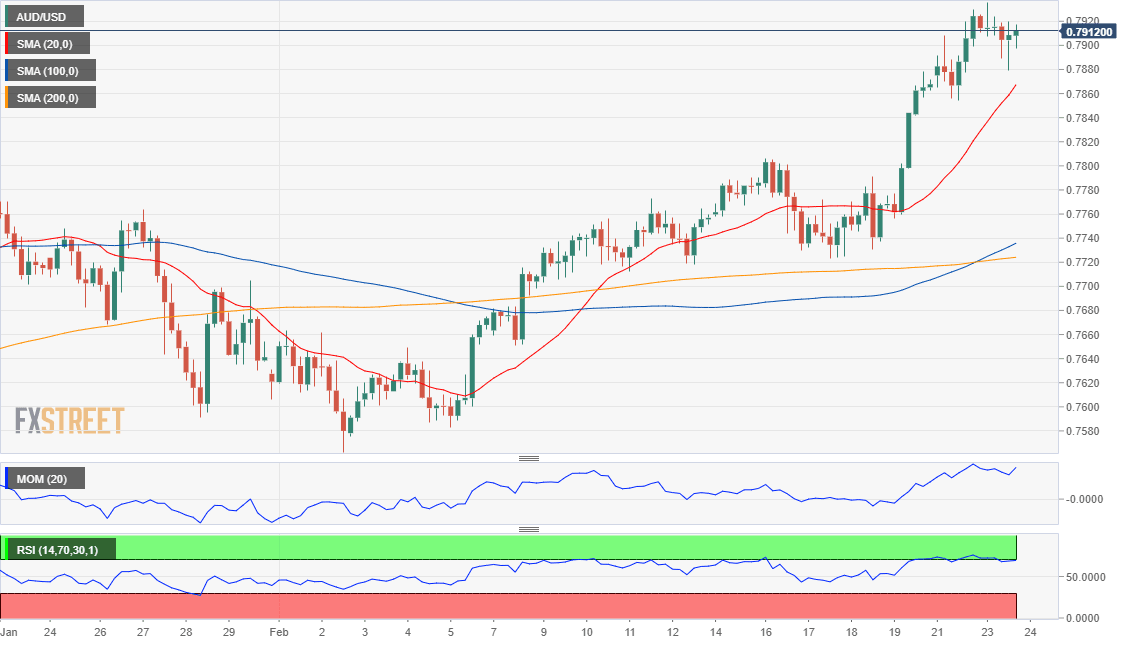 - El AUD/USD cotiza alrededor de 0.7910 y todavía está preparado para probar la zona de precios de 0.8000.