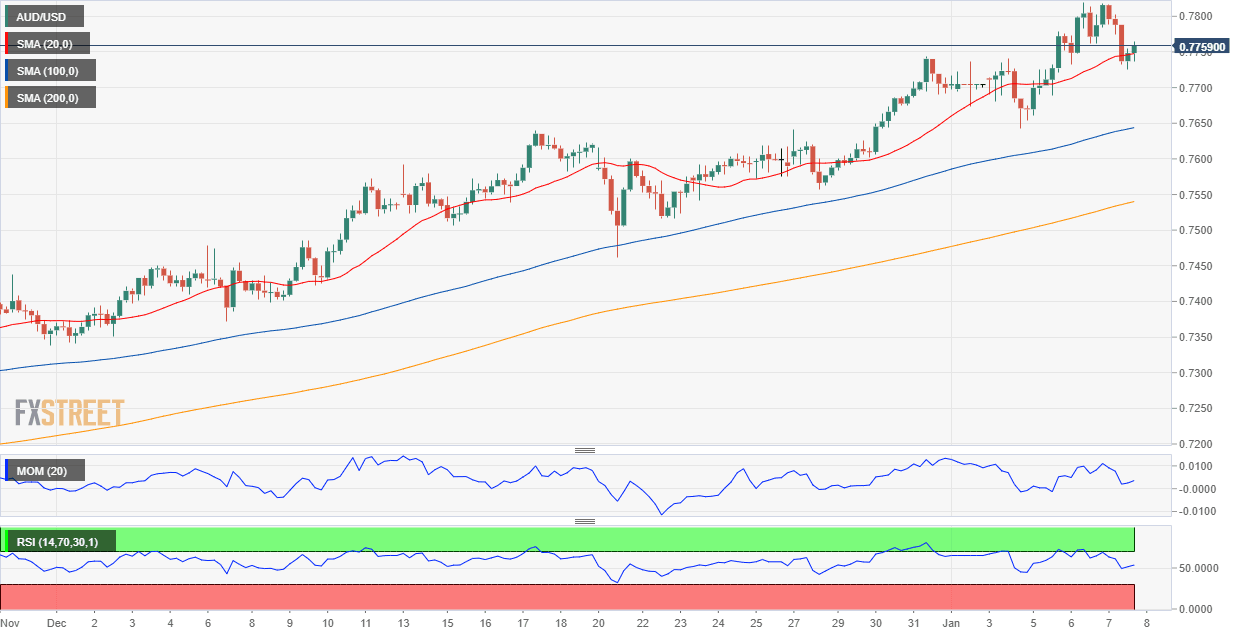 La última caída parece correctiva ya que el par AUD/USD mantiene su postura alcista en el corto plazo. En el gráfico de 4 horas, el par ha logrado mantenerse por encima de una media simple alcista de 20, que sigue avanzando por encima de las más largas. Los indicadores técnicos están retomando lentamente sus avances dentro de niveles positivos luego de corregir las condiciones de sobrecompra. En general, el par tiene espacio para extender sus ganancias más allá de sus máximos recientes en el área de 0.7800.
