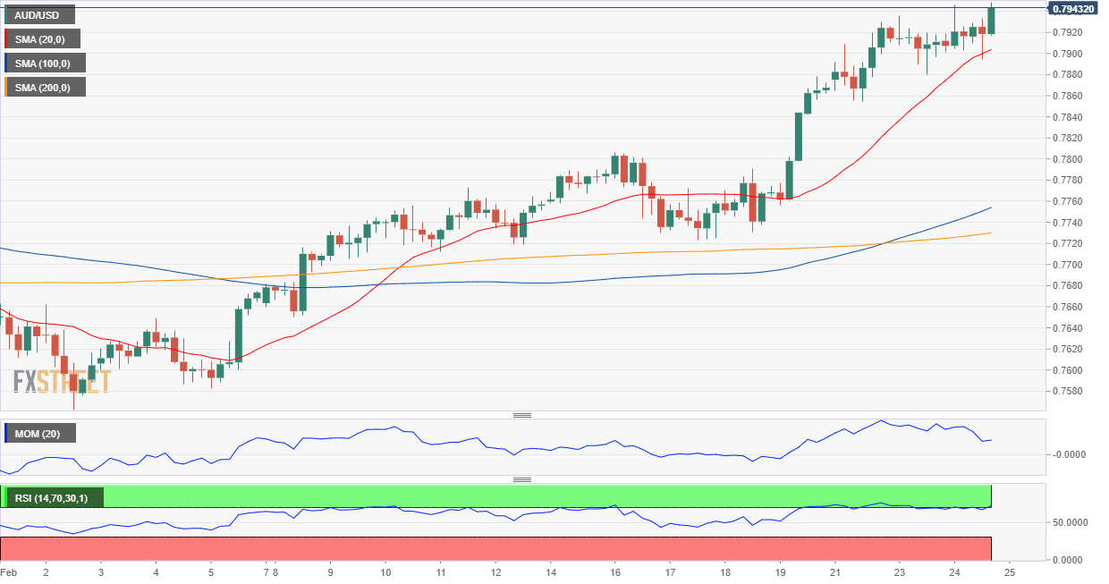 El par AUD/USD reanudó su avance y alcanzó un nuevo máximo de varios años de 0.7948, listo para cerrar el día unos pips por debajo de él. El impulso positivo de Wall Street brindó soporte al dólar australiano, mientras que los rendimientos de los bonos del Tesoro que retrocedían desde los máximos intradiarios limitaron el avance del dólar. El tono más suave de los precios del oro limitó parcialmente el potencial alcista del par.