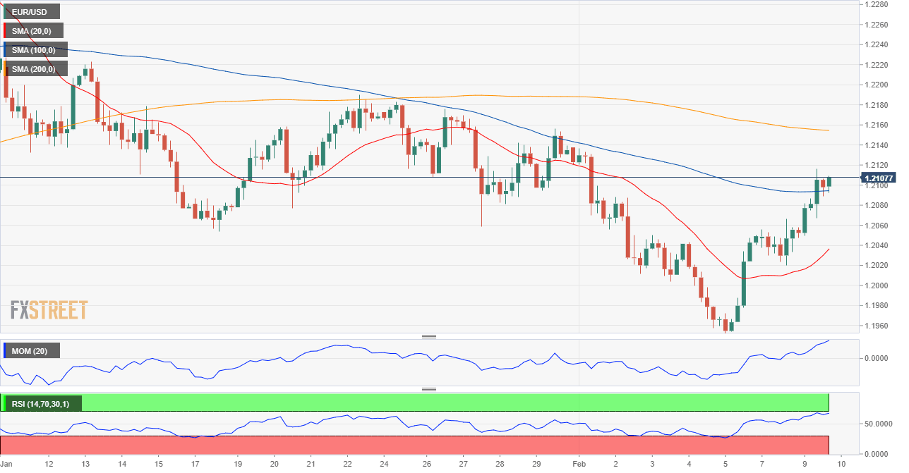 El par EUR/USD descendió modestamente desde el máximo mencionado, operando un puñado de pips por encima del nivel de 1.2100. El EUR/USD cotiza por encima del 38.2% de retroceso de su rally de noviembre/enero después de recuperarse del 50% de retroceso, lo que abre la puerta a una recuperación más pronunciada, aún por confirmar. En el gráfico de 4 horas, el par se siente cómodo por encima de la SMA plana de 100, mientras que la SMA de 20 avanza por debajo de él. Los indicadores técnicos han superado las lecturas de sobrecompra, perdiendo parcialmente su fuerza alcista. Es probable que haya más ganancias en una ruptura por encima de 1.2120, el nivel de resistencia inmediato.